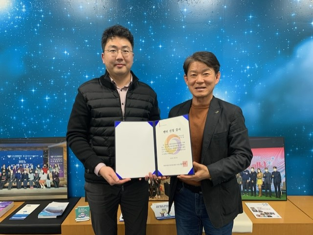 Listbook 公司首席执行官崔乘烈(照片左侧)从 K-ICT 初创企业辅导中心主任崔秉熙(Byeonghee Choi)手中接过指定受辅企业的选拔证书,并合影留念。(照片由 Listbook 提供)